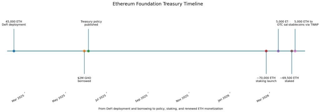 A timeline charts the Ethereum Foundation’s treasury moves from February 2025 through April 2026, spanning DeFi deployment, GHO borrowing, staking, and ETH conversions.