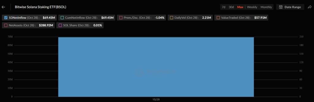 On Oct. 28, Bitwise’s Solana Staking ETF (BSOL) debuted with $69 million in first-day inflows, the strongest launch among roughly 850 ETFs introduced this year, according to SosoValue data.