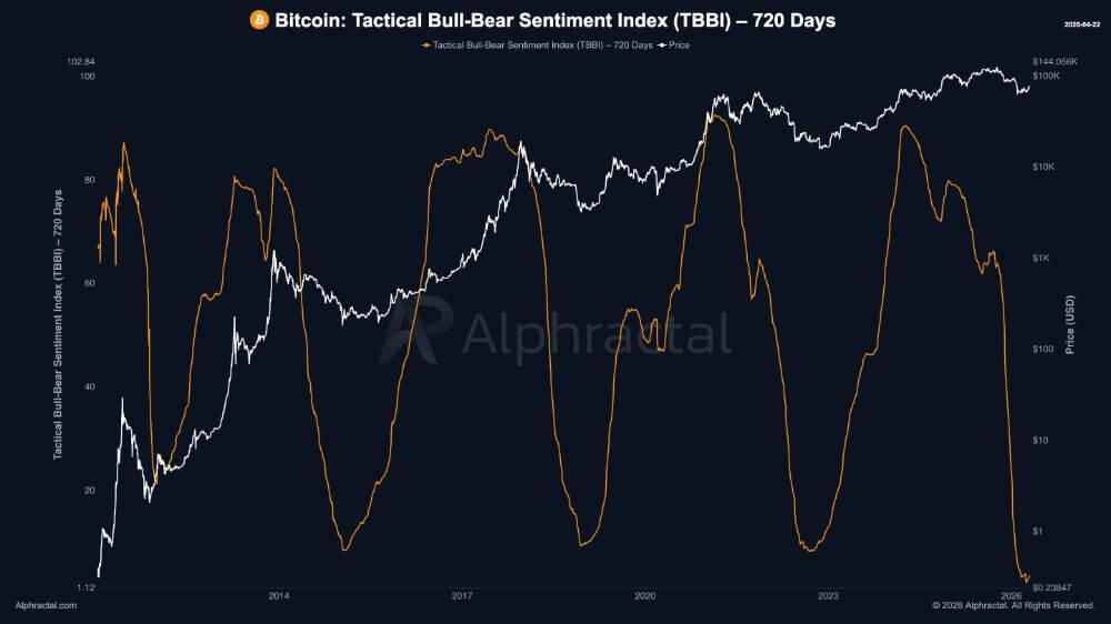Alphractal’s chart shows its sentiment Index plunging to extreme lows near several major Bitcoin troughs, indicating sentiment and positioning appear to be back in a historical capitulation zone rather than at an ordinary dip.