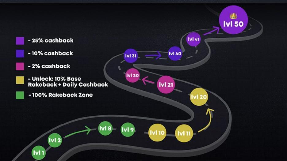 Once players advance past Level 9, the system transitions to a permanent 10% base rakeback paired with daily cashback rewards. Cashback begins at 2% and increases through the remaining tiers, reaching a maximum of 25% at the highest levels.