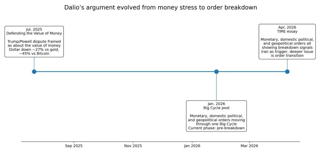 A timeline charts three Dalio essays from July 2025 to April 2026, tracing his argument from dollar devaluation through Big Cycle pre-breakdown to full monetary and geopolitical order collapse.