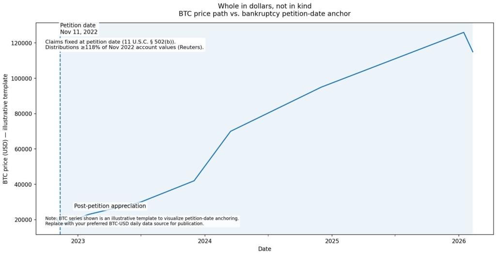 Chart shows Bitcoin price rising from $16,000 at FTX’s November 2022 bankruptcy petition date to over $100,000, illustrating gap between dollar-based claims and in-kind asset appreciation.